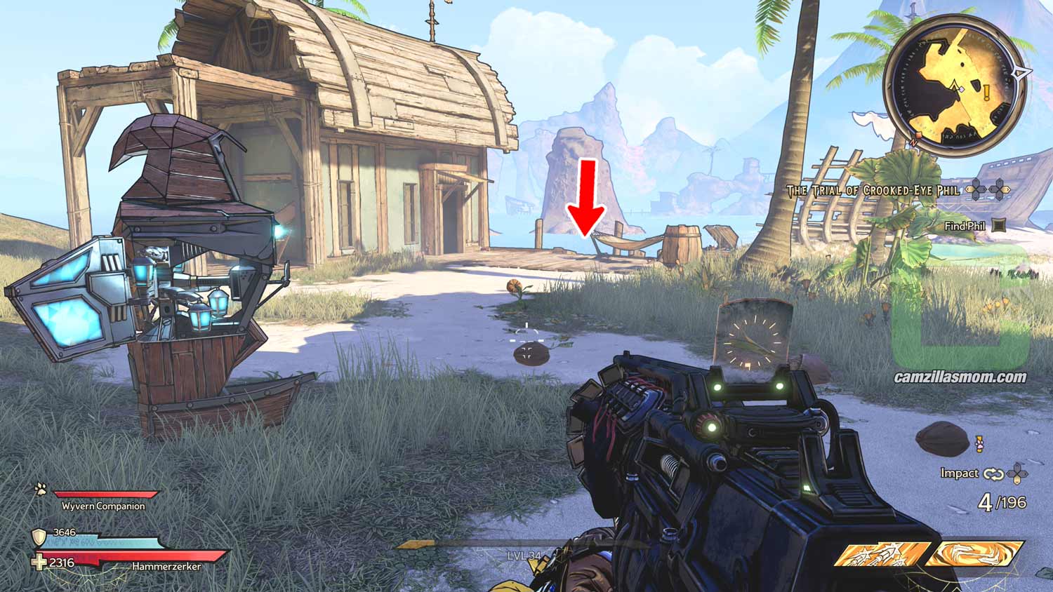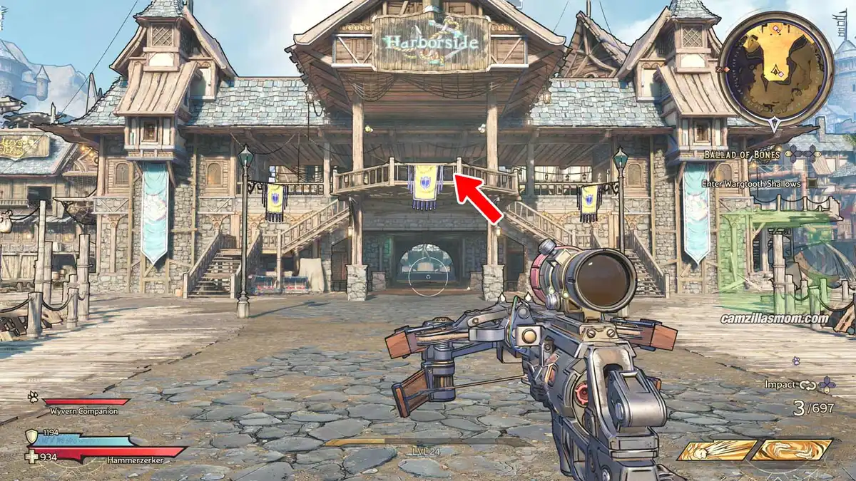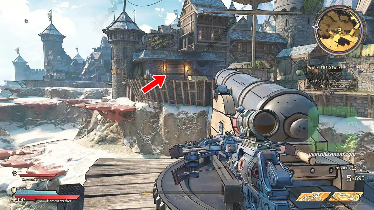East of “Izzy’s Fizzies” is a ship’s birds nest/lookout. At its feet is a hidden room blocked by a wall. Go over to the pier of “Harborside”. There is a cannon. To fire it, shoot the barrel with explosives in the sea bed below it. Just follow the rope from the cannon to the barrel. The Cannon shoots and the path is open. But be careful. Some pirate thugs want it too.