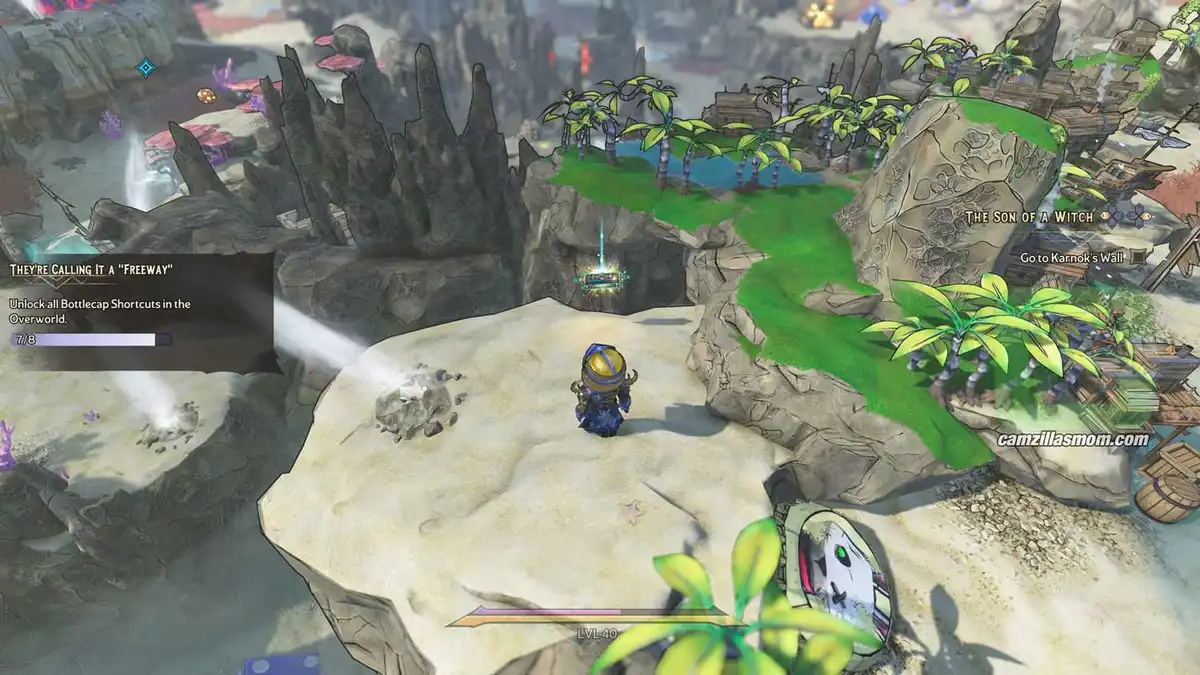 Not far from the “Dumpstat Torch” is a blocked gate with a shipwreck in front of it. There are two cannons you can fire from that ship. One will destroy the gate. The other one is on the upper deck. Use the nearby purple sparkling trampoline to get to the top of the area. From there, you can jump down to the ship to fire said cannon. This will open the barricaded nearby cave where the Lore Scroll is.