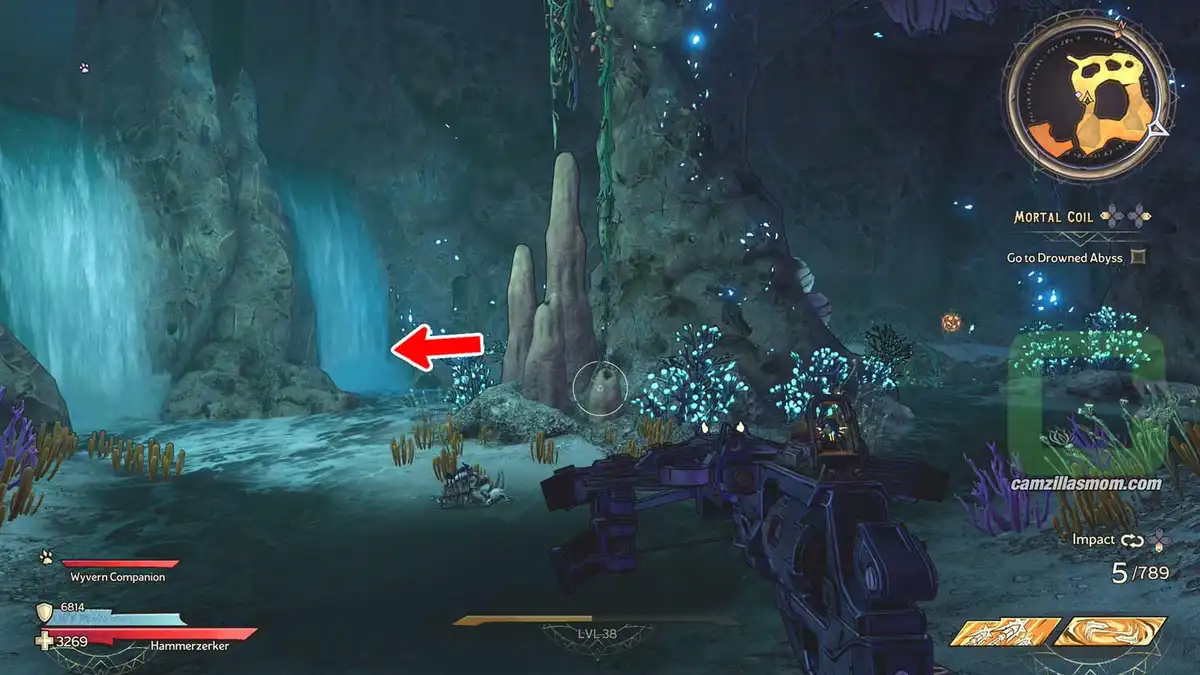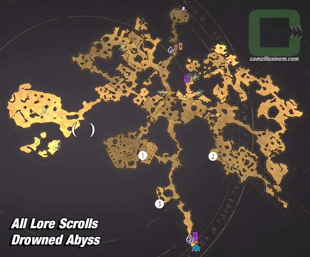 Near the Drowned Abyss entrance is a black, red glowing wall you can destroy to the left. Do so and it opens a passage. You can even see a Lucky Dice in there. Next to the Dice is a waterfall. Walk through and you will find this scroll.