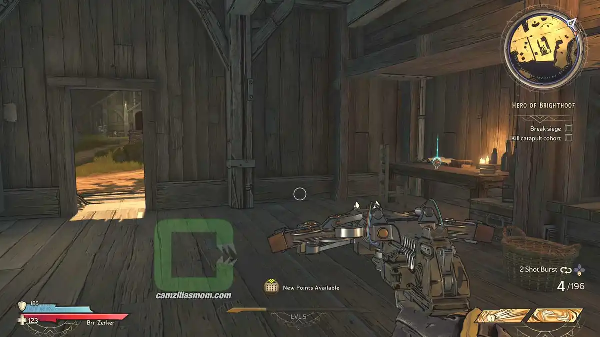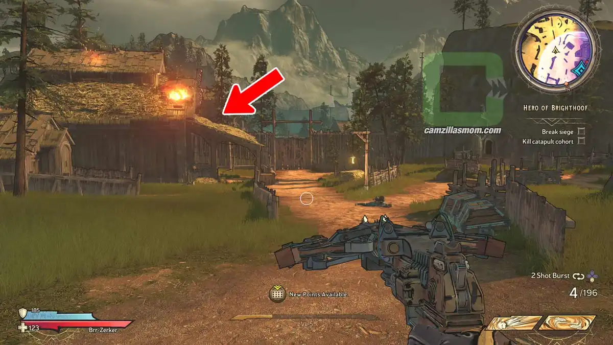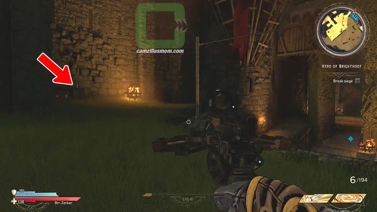 This Lore Scroll is at Queen’s Gate. While you’re doing the “Hero of Brighthoof” Quest, you have to pass Queen’s Gate. Here you have to destroy a couple of catapults in the town of “Buttsville”. This Scroll is in the area of the second catapult in the building next to the southern gate.