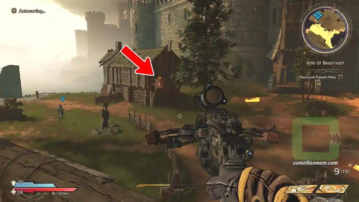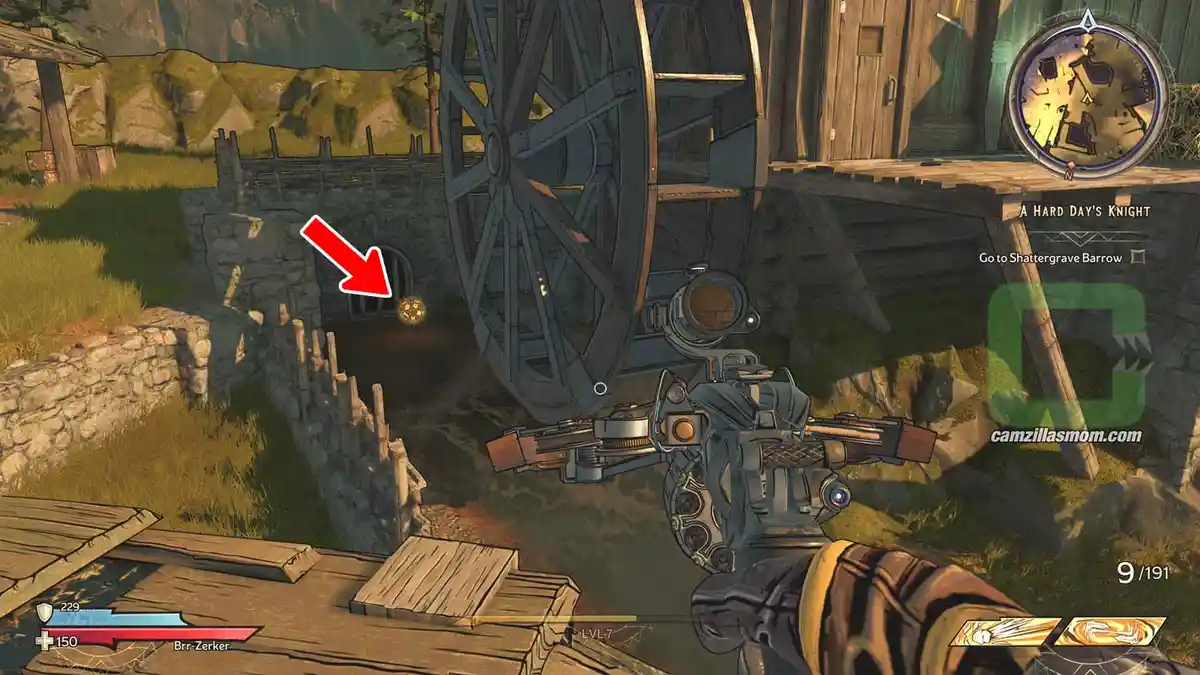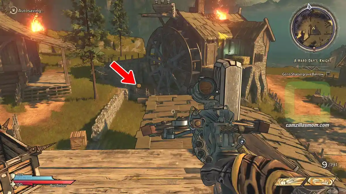For this Die, go back to the south of town. You know, at the beginning, there is a bridge you can cross into “Buttsville” town. The gates to this part of town open when you finish the quest. Here, at the mill, is the next die.
