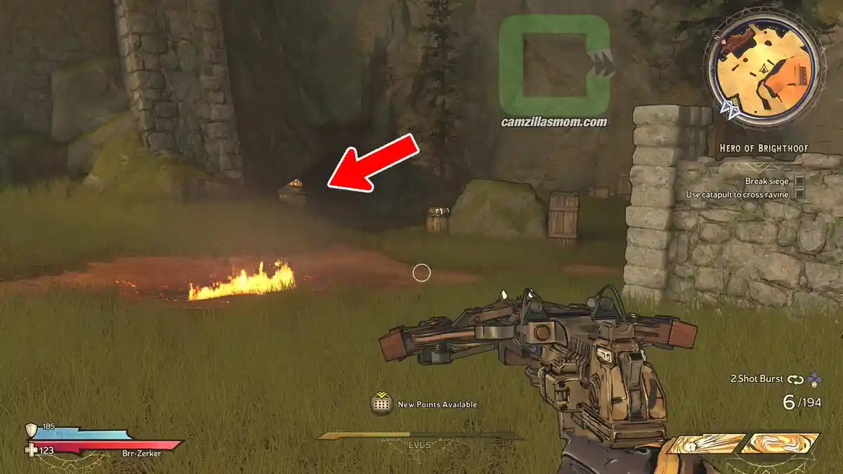 You destroyed the first catapult and entered the area of the second catapult. North of the catapult is a small cave. Inside is Lucky Die 3.