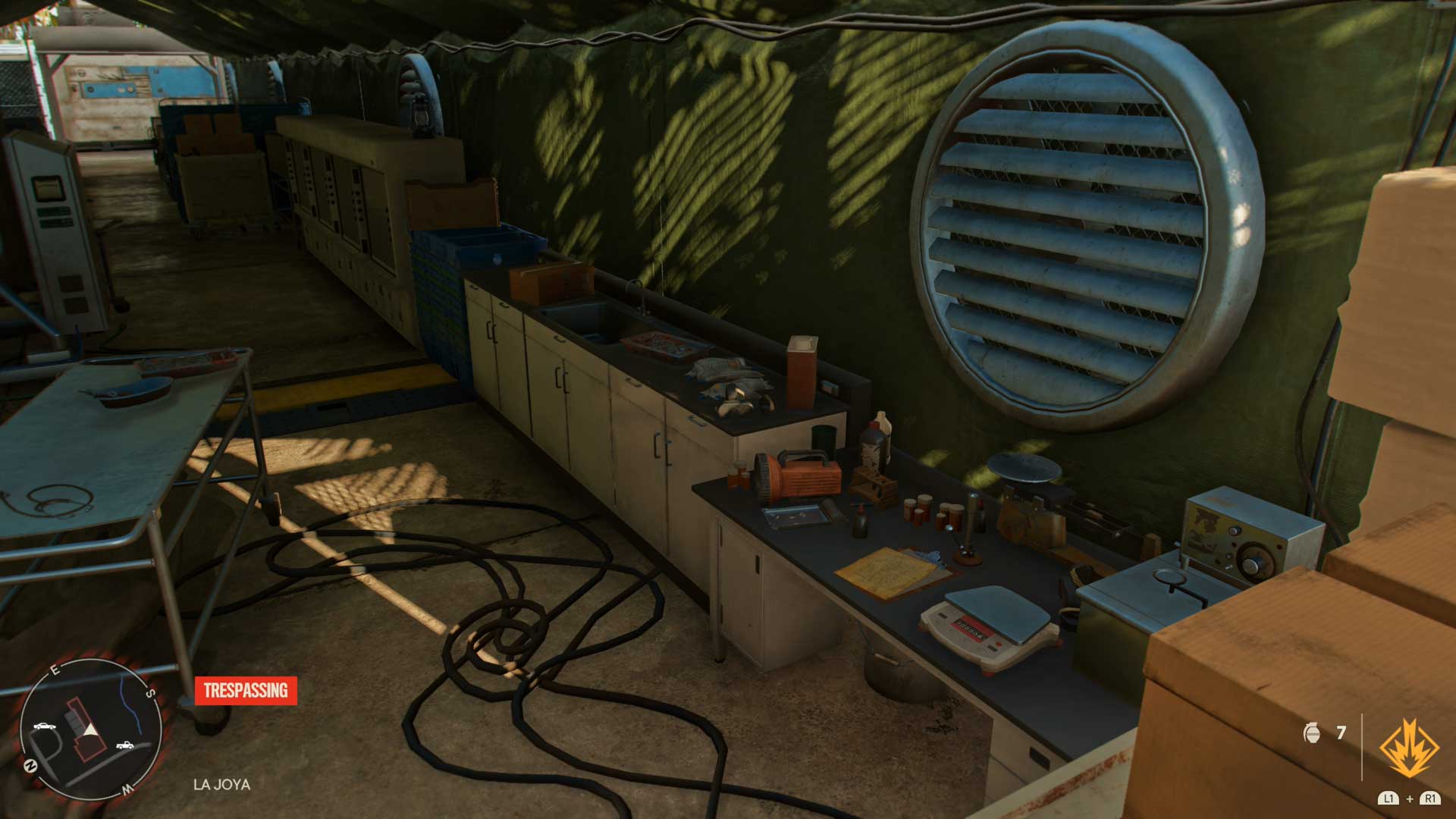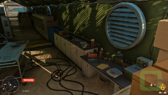 Right when you exit the trailer and enter the green tent, look to the right where the round vent is.