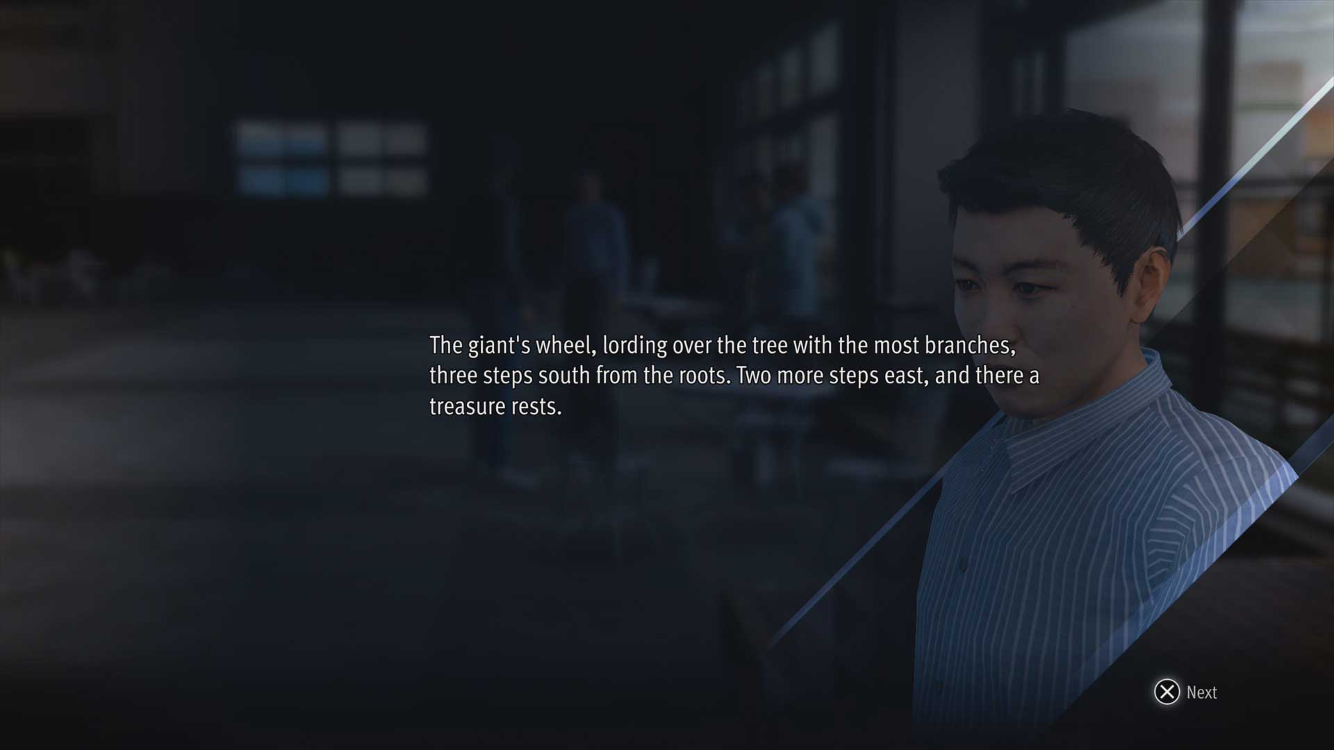 "The giant's wheel, lording over the tree with the most branches, three steps south from the roots. Two more steps east, and there a treasure rests."